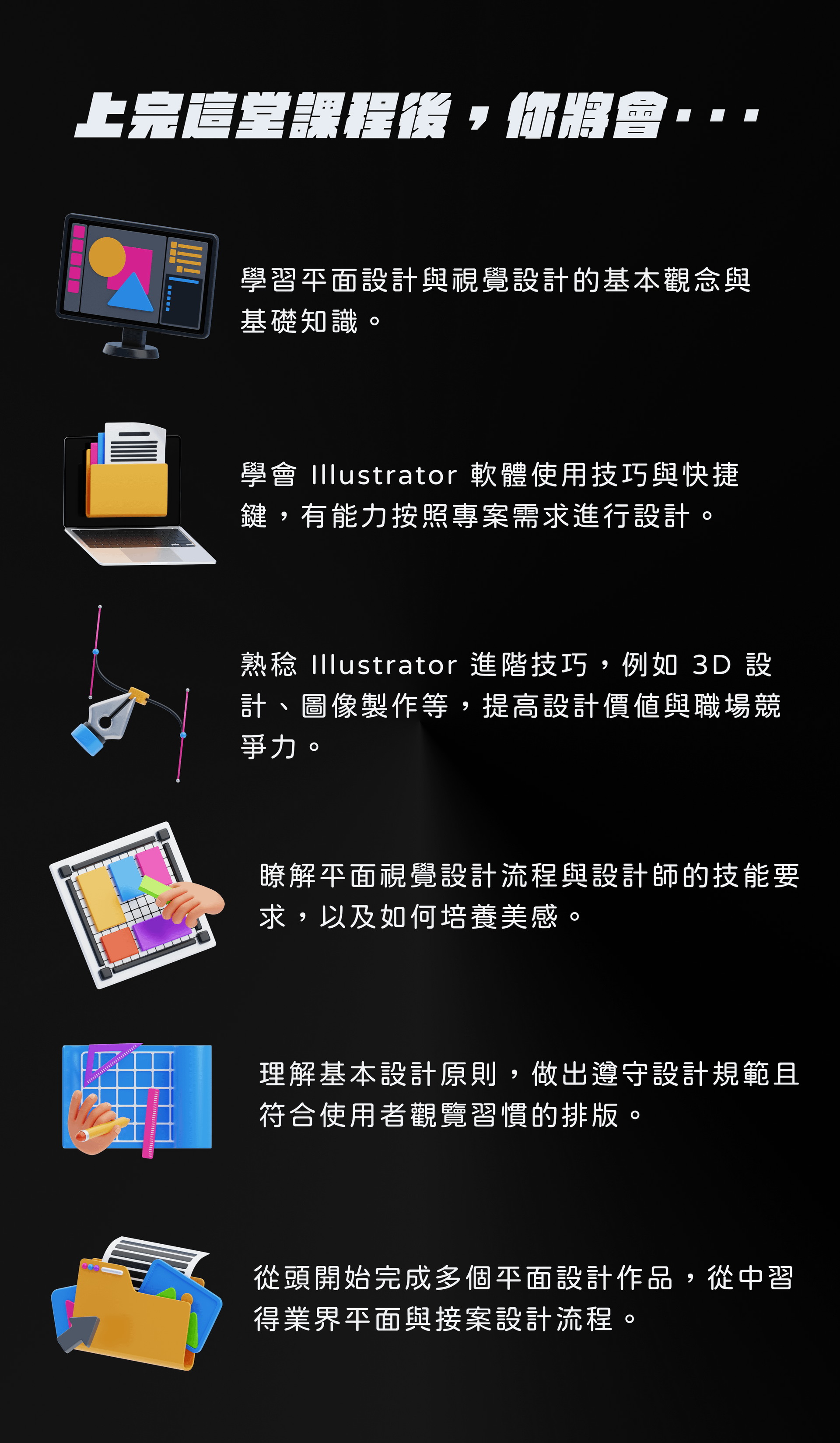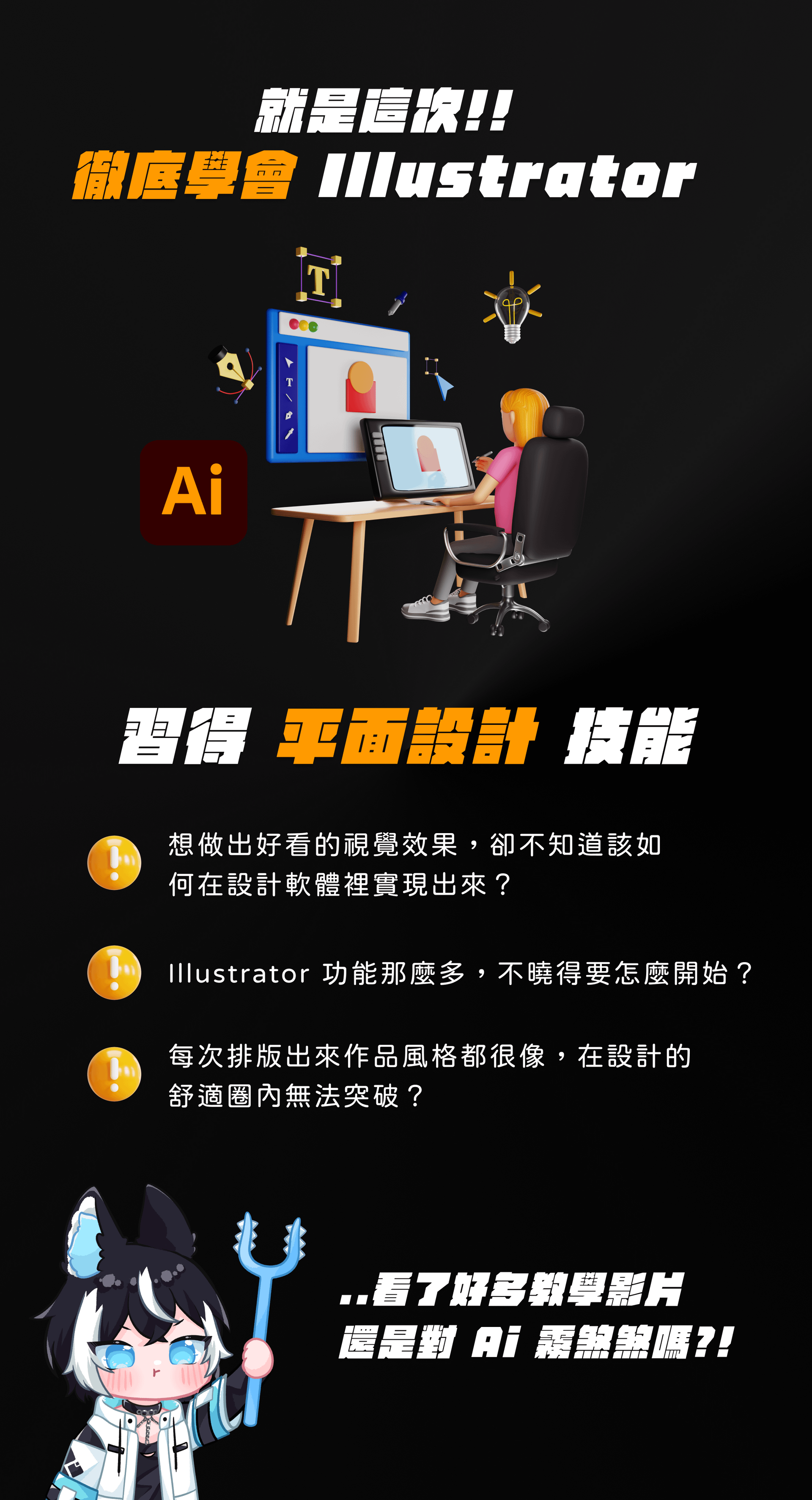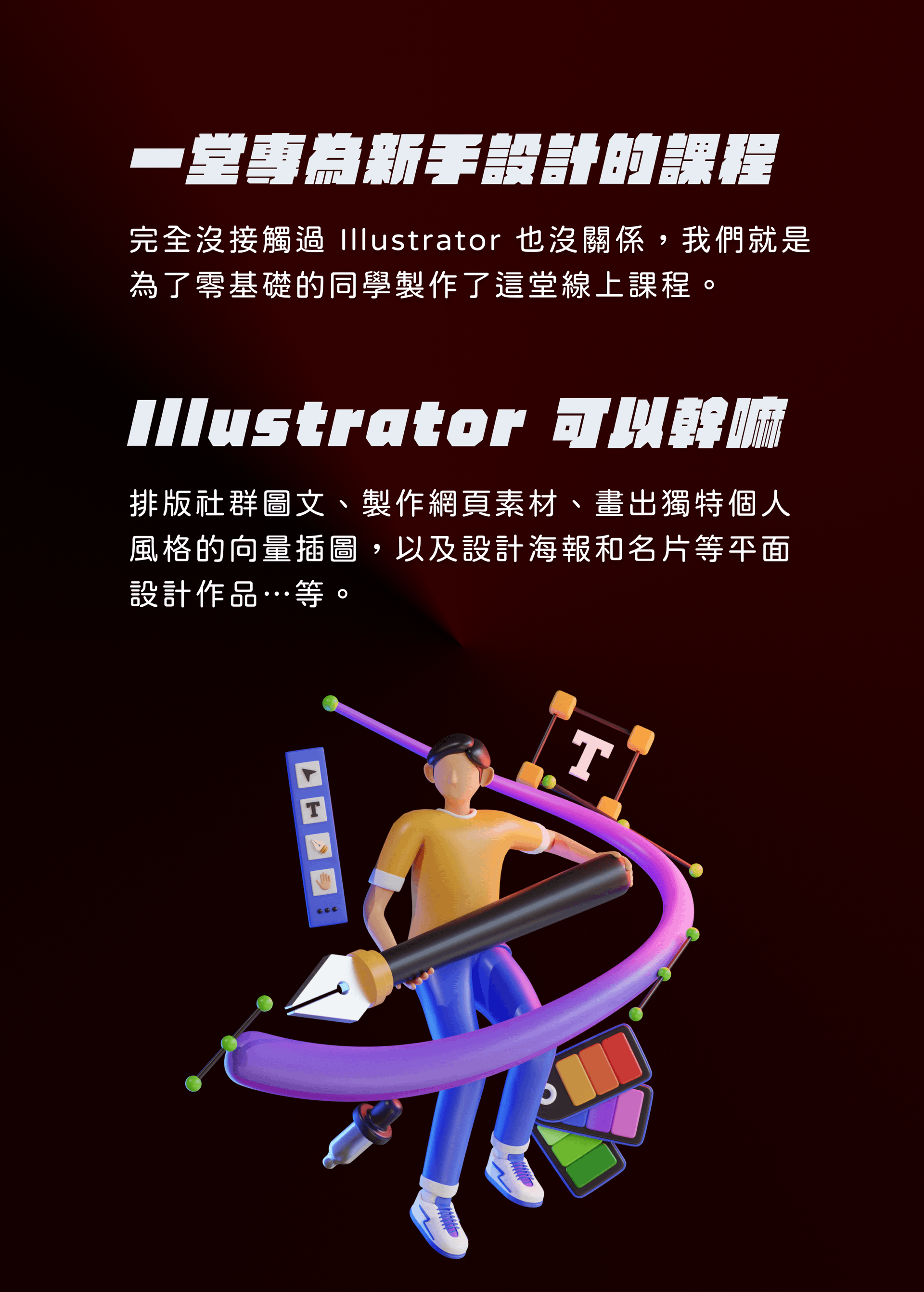 專為想提升設計技能的創作者打造。不論你是剛開始使用 Adobe Illustrator 的新手,還是已經具備一定經驗的設計師,這門課程都會帶你深入探索 Illustrator 的各種功能與技巧,幫助你在短時間內掌握平面設計的訣竅。