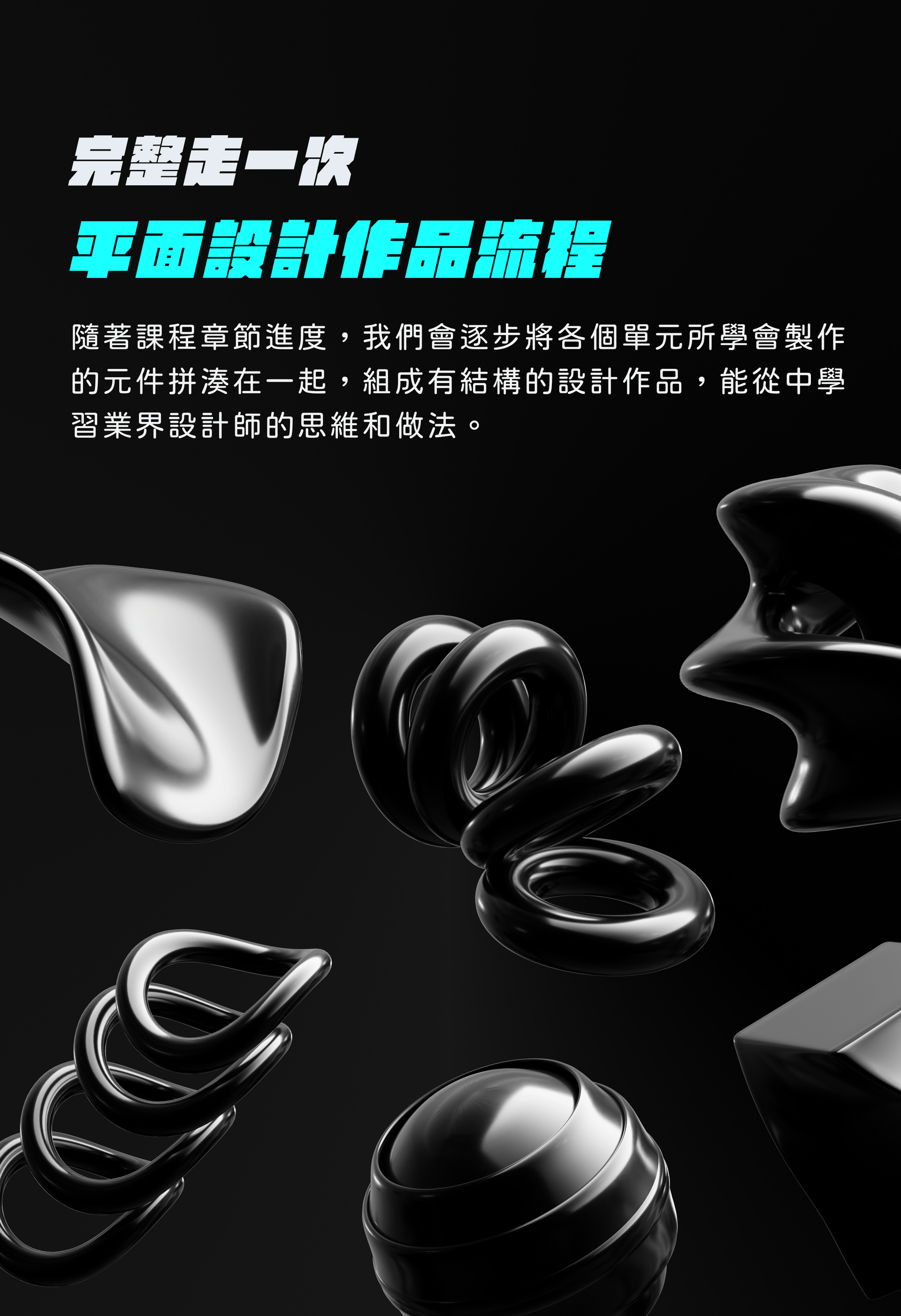 •真實設計案例應用:本課程不僅僅教你工具的使用,還會透過真實的設計專案來展示如何將這些技巧運用到實際工作中,讓你不僅學會技術,更能提升設計思維。