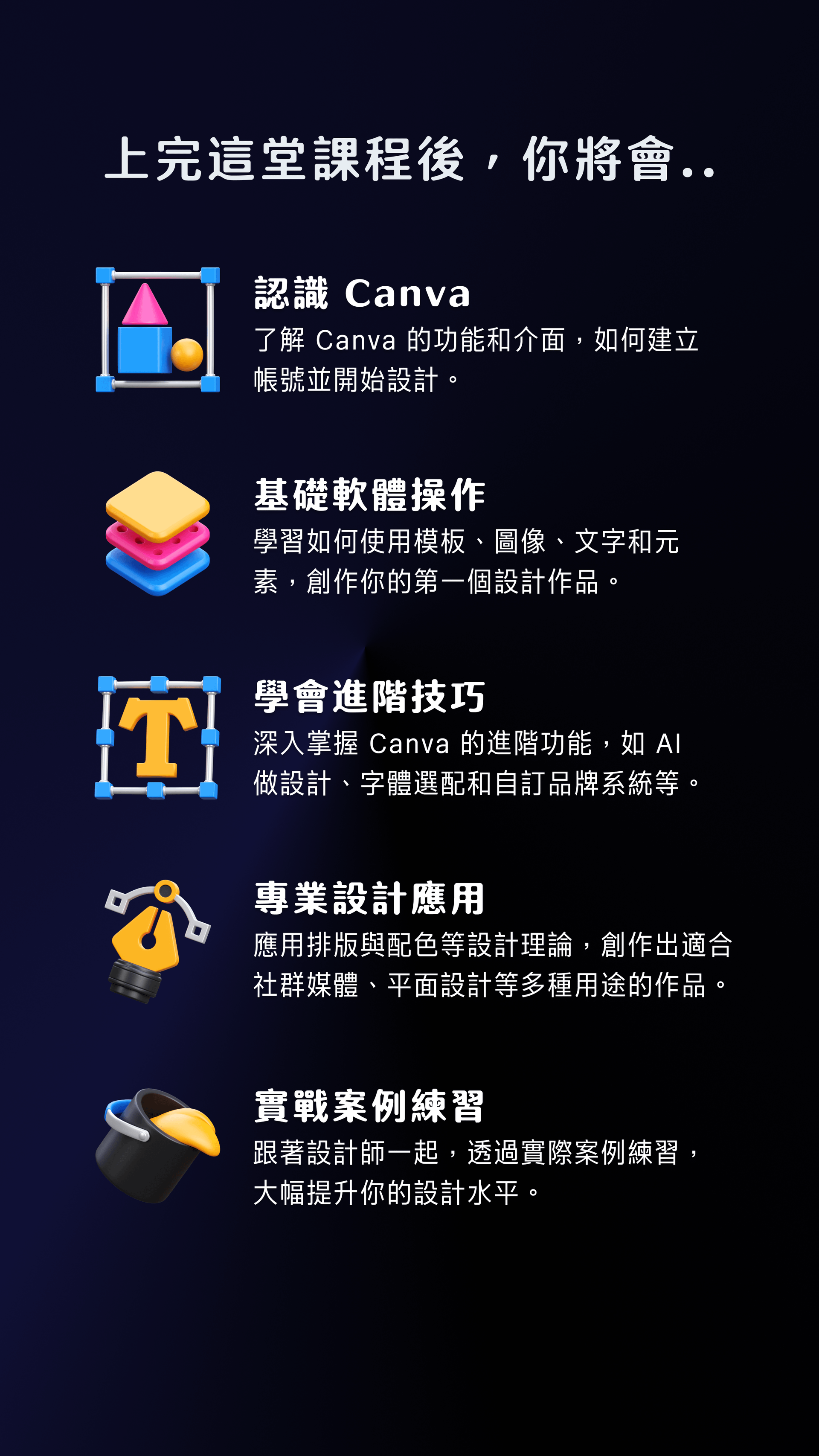 3. 進階技巧:深入掌握 Canva 的進階功能,如 AI 做設計、字體選配和自訂品牌系統等。