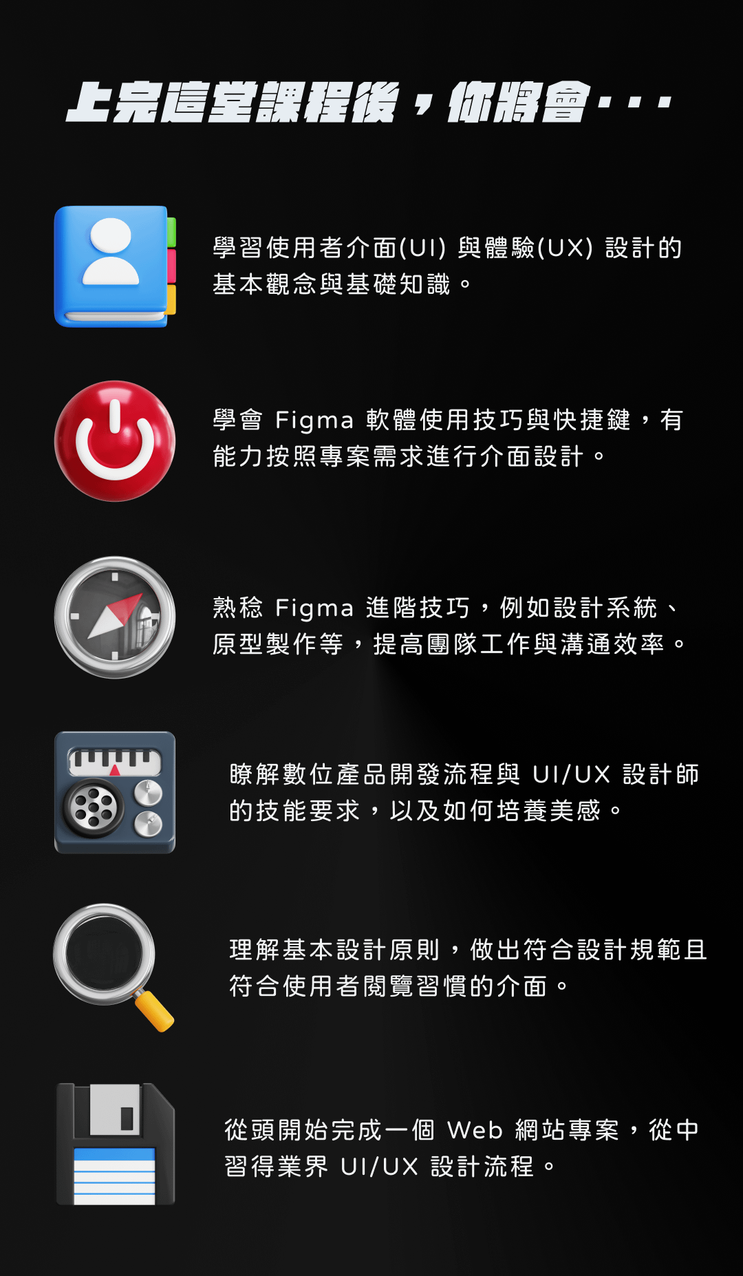 - 學習使用者介面(UI) 與體驗(UX) 設計的基本觀念與基礎知識。