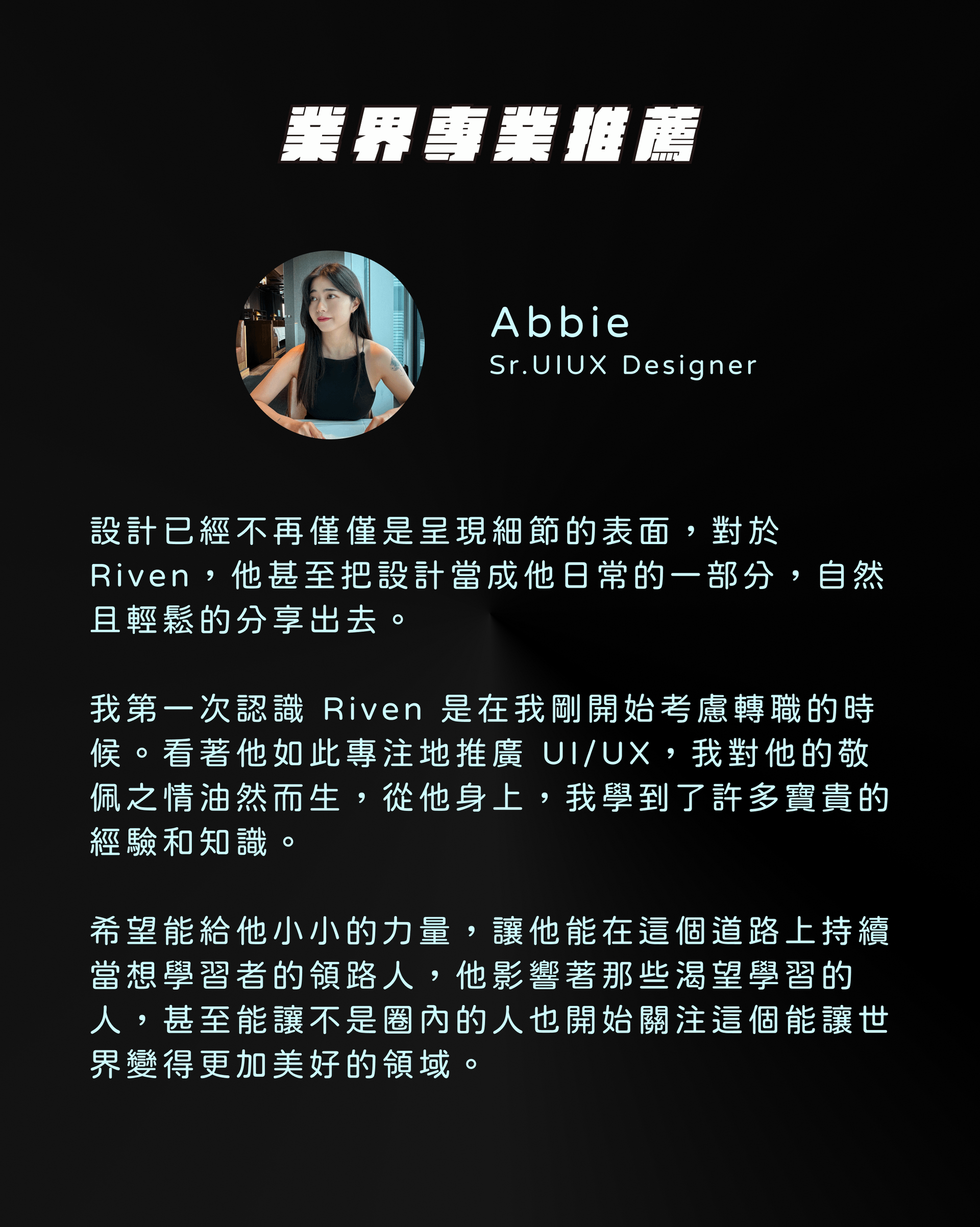 常在 Medium 寫作設計上的知識與觀察,並得到官方認證 #Design 領域 Top Writer,同時也會在 YouTube 上製作影片教學設計的方法,近期開始實驗使用 VTuber 技術在 IG 用 Reels 短影片分享設計技巧。