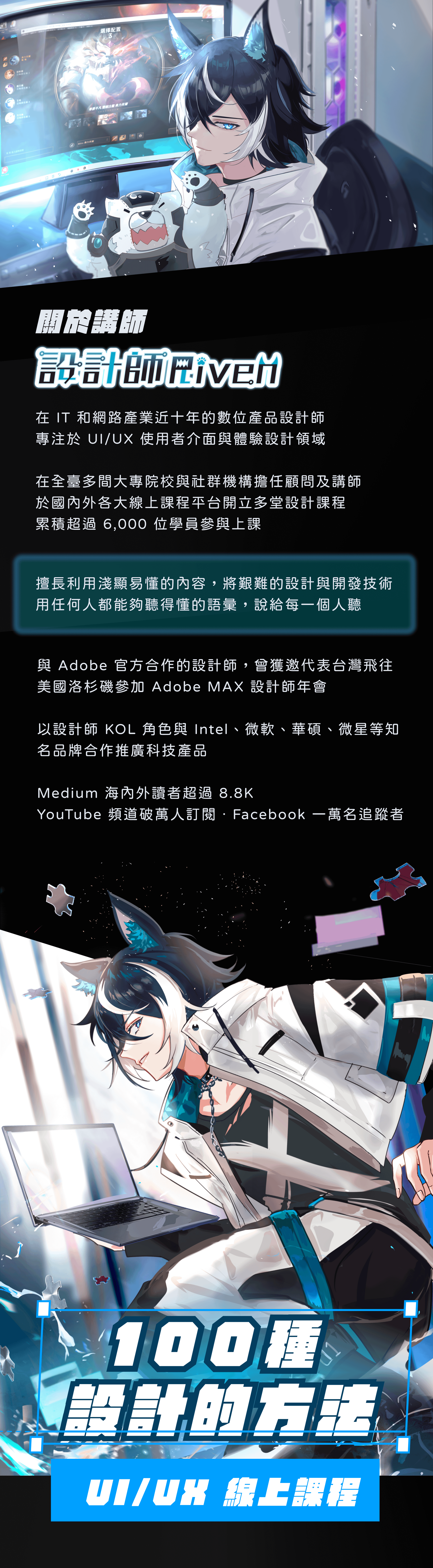 在 IT 和網路產業近十年的數位產品設計師,專注於 UI/UX 使用者介面與體驗設計領域,在全臺多間大專院校與社群機構擔任顧問及講師,並於國內外各大線上課程平台開立設計課程,目前已累積過萬名學員參與上課。