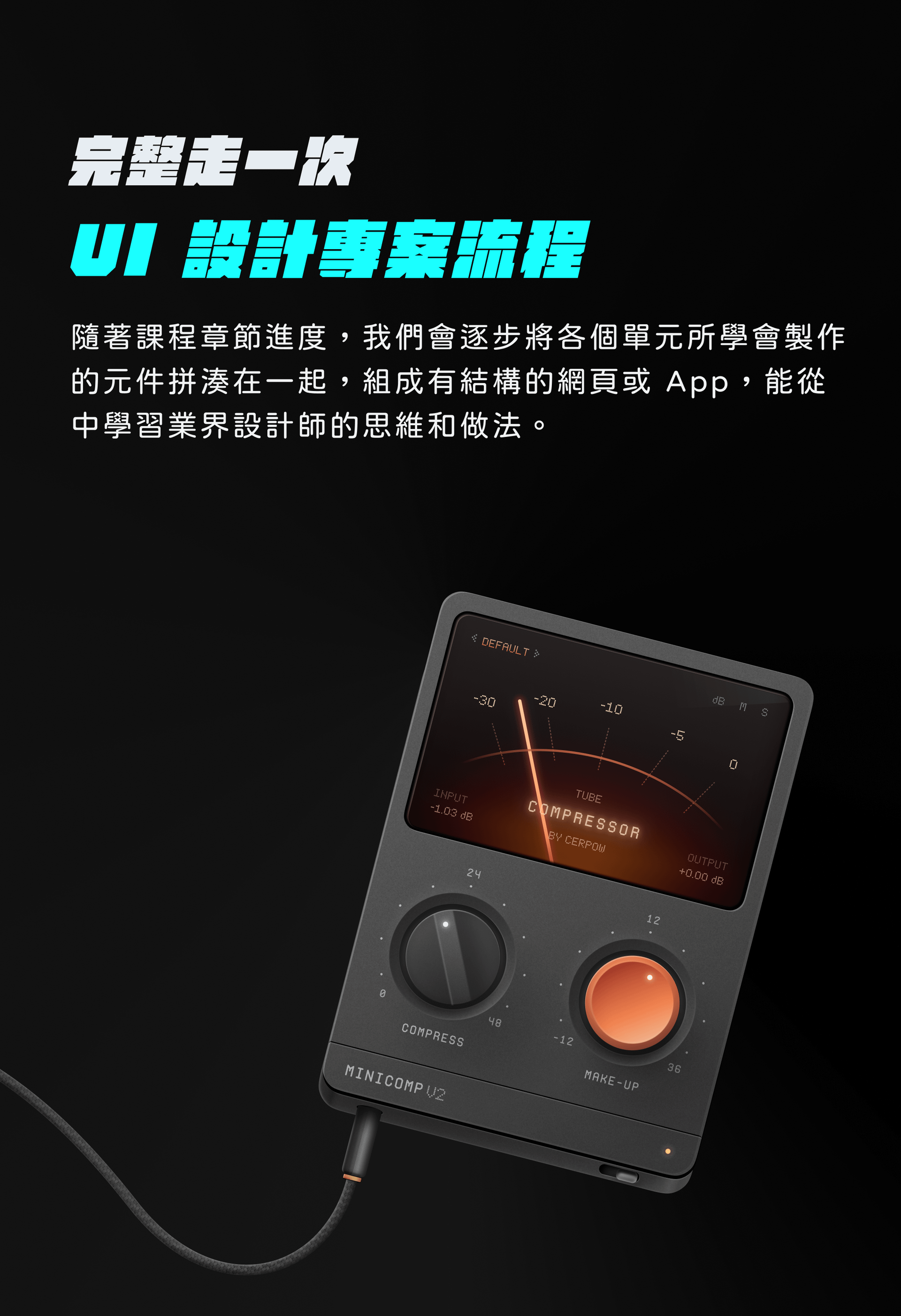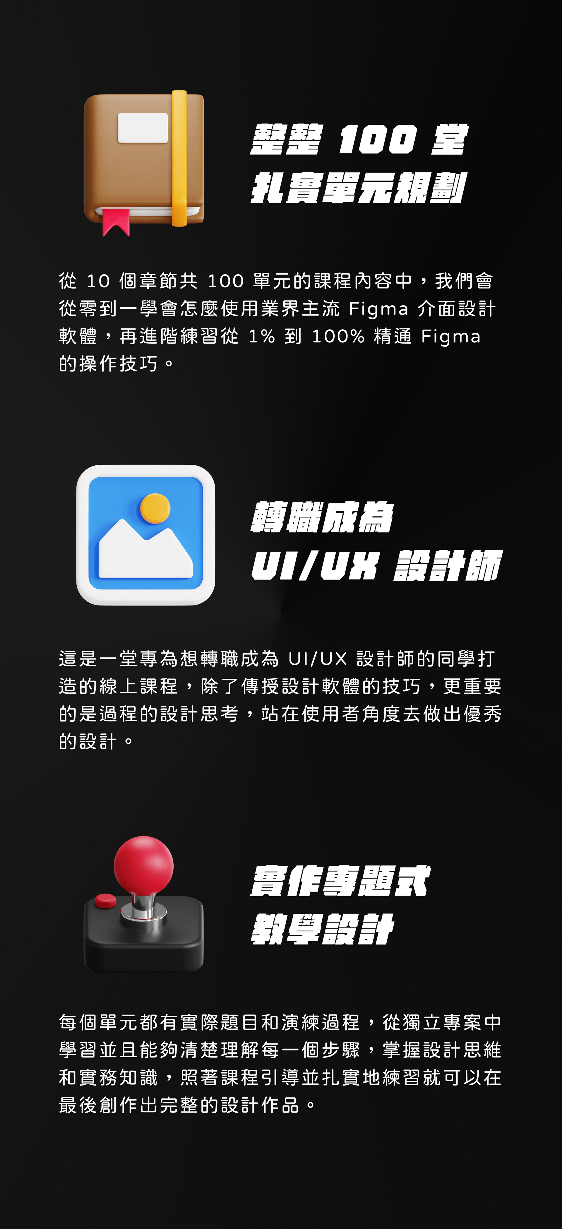 課程採用實作專題式教學設計,每個單元都有實際題目和演練過程,從獨立專案中學習並且能夠清楚理解每一個步驟,掌握設計思維和實務知識,照著課程引導並扎實地練習就可以在最後創作出完整的設計作品。