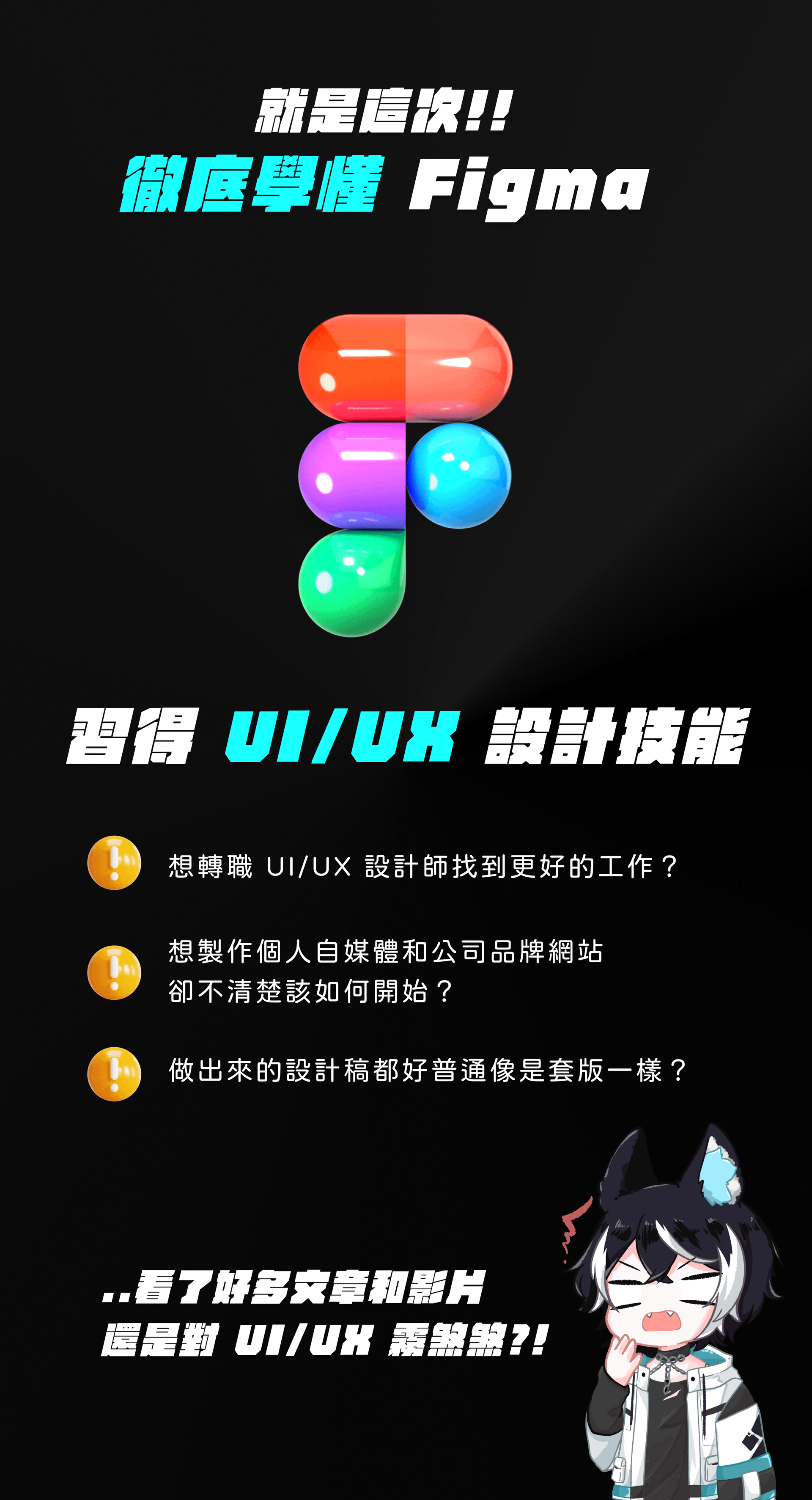 這是一堂專為想轉職成為 UI/UX 設計師的同學打造的線上課程,從 10 個章節共 100 單元的課程內容中,我們會從零到一學會怎麼使用業界主流 Figma 介面設計軟體,再進階練習從 1% 到 100% 精通 Figma 的操作技巧。
