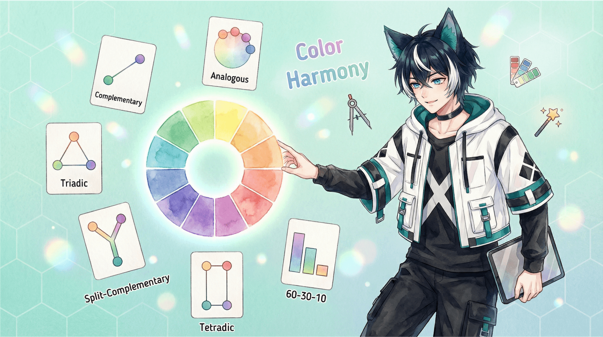 色輪上的顏色不是隨便放的——它們之間存在數學關係,而這些關係直接決定了配色好不好看。這篇文章會帶你從色輪基礎開始,拆解六種經典配色法則(互補色、類比色、三角配色、分裂互補、矩形配色、60-30-10 法則),每一種都告訴你什麼時候用、怎麼用、要避開什麼坑。讀完之後,你的配色會從「碰運氣」變成「有方法」。