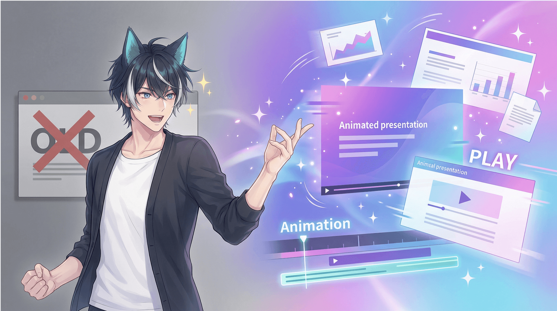 傳統做法:先用 AI 生成圖片 → 再找其他工具做動畫 → 匯出 GIF → 插入簡報